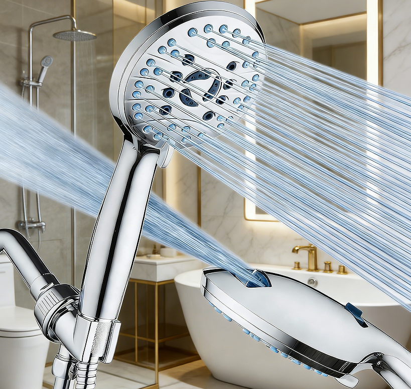 This multi-functional handheld showerhead combines everyday cleaning convenience with water-saving efficiency. The casing is made of durable, scratch-resistant chrome-plated ABS material and has a diameter of approximately 95mm. The manufacturing process utilizes integrated molding technology to ensure structural integrity and watertight sealing. The internal design features self-cleaning silicone nozzles and a separate powerful single-stream cleaning mode. Its water-saving mechanism is achieved by optimizing the nozzle aperture and distribution in different modes, providing powerful rinsing while effectively managing the total water flow.